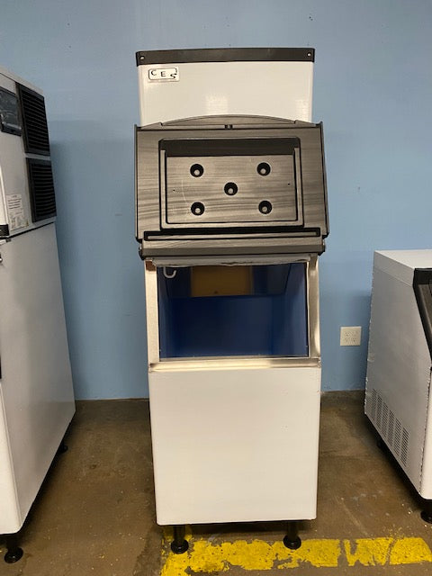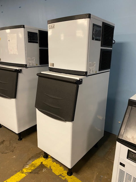 115v, dispenses full cubes (or half cubes while inventory lasts). Air-cooled. Water filter and drain line included.