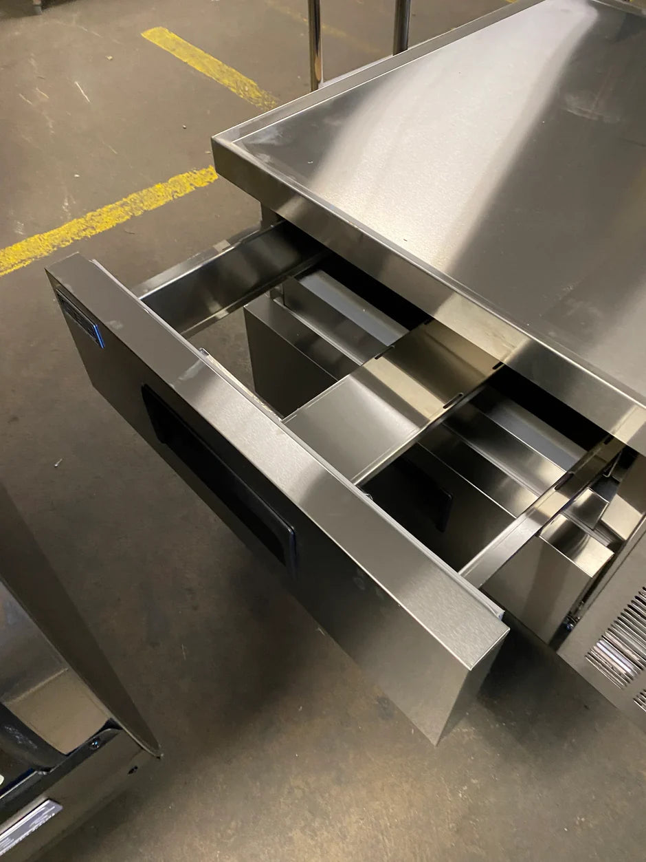 36" Chef Base. Runs on 110v electric. 2 drawers with dividers. No pans included. Stainless steel interior and exterior. Top equipped with a marine edge enables the unit's top to contain drips and spills for easy cleanup. Temp range 33-41°. Pre-installed heavy-duty casters with brakes. Heavy-duty pull handles. Electronic control system makes it easy to adjust temp settings. R290 refrigerant