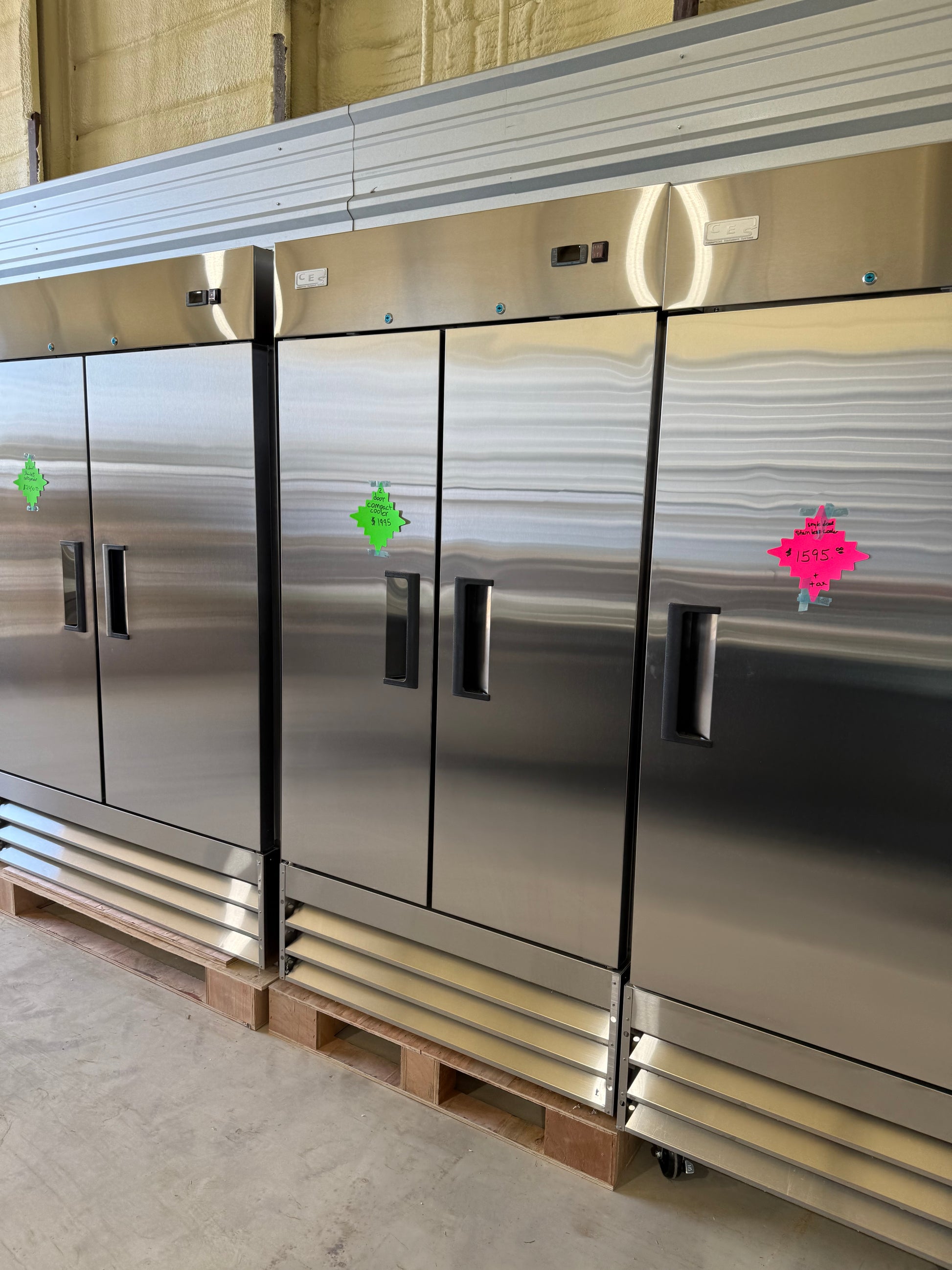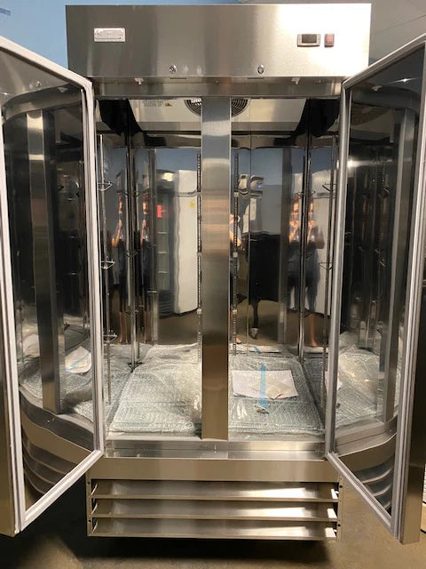 2 Door Stainless Cooler. Runs on 115v electric. Stainless steel interior and exterior. Self closing doors with 90 degree stay-open feature. Locks and keys included. Adjustable heavy-duty PVC coated shelving. Electronic control system making it easy to adjust temp settings. Pre-installed heavy-duty casters with brakes. R290 refrigerant.